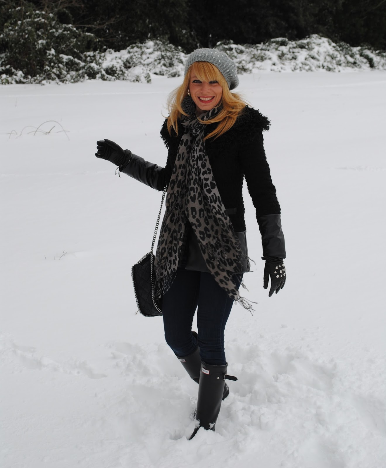 Certo che ti riconosco! E mi piaci tanto!!!! Molto sbarazzina… Solo tu in mezzo alla neve puoi essere così fashion! Hunter, Falabella e stampa leopardo: sei un mito Selvy!!!! Però dì la verità: gli Hunter saranno anche orrendi, ma non passa un goccio d'acqua!