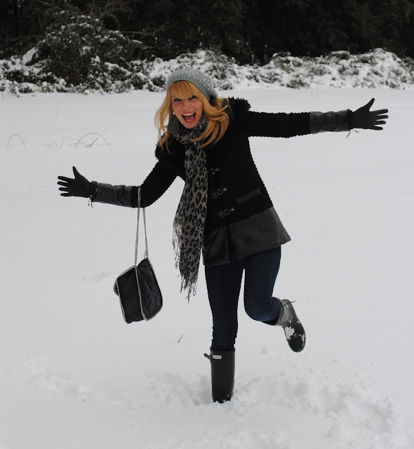 Awwww, I like your Hunter rain boots! I love your outfit too–the coat, scarf, gloves are fantastic! That bag is amazing! The earrings are so unique! That is a lot of snow but you look like you're having fun in it!