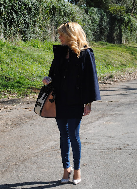 Ciao cara, buongiorno. In queste foto sei bellissima, sul serio! La cappa è molto raffinata e chic, la borsa non ne parliamo nemmeno e le scarpe sai come la penso…. Stai benissimo e devo dire che le foto sono molto belle: grande Ric!!! Nella prima foto poi sei super super faiga, sembri una modella!