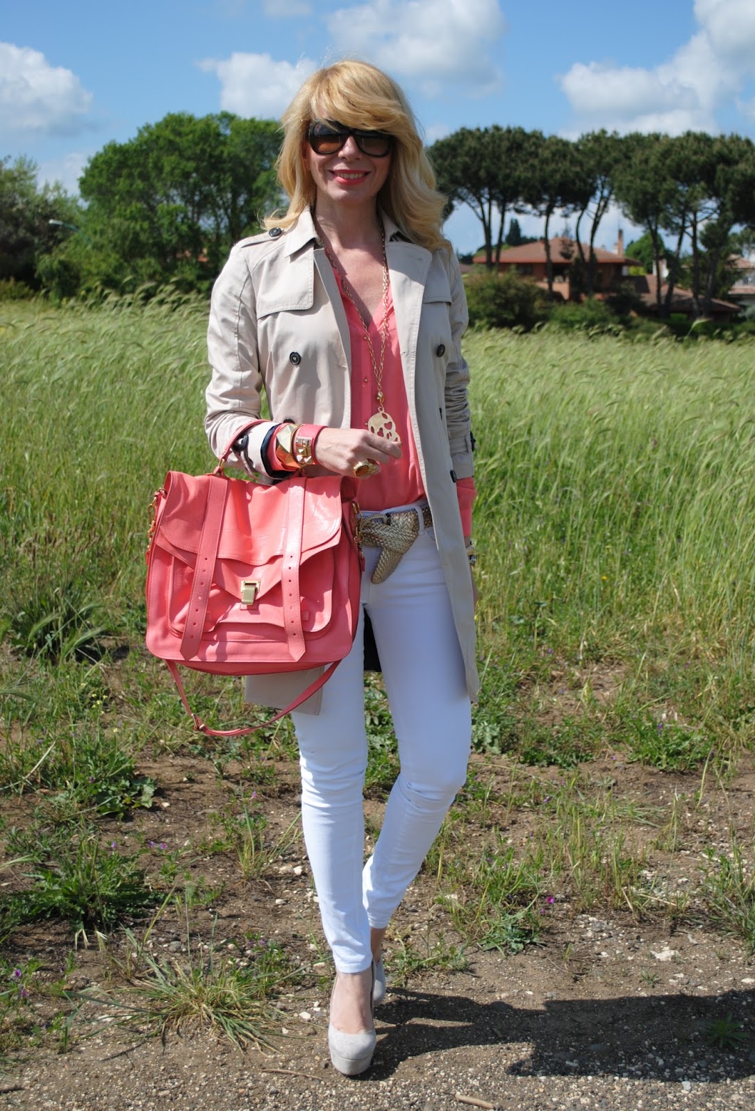 Io non lo trovo per niente brutto questo outfit…anzi mi piace molto il tuo accostamento del trench con il pantalone bianco e il tocco corallo !!! Bella! 🙂