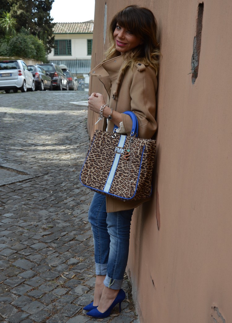 Così ecco spuntare degli sprazzi di blu elettrico sulle scarpe e sui manici della Mia bag di Pomikaki , contrapposti alla delicata trama leopardata della borsa.