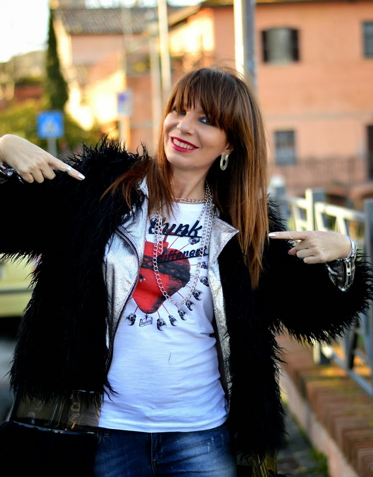 Stai sempre molto bene con questo stile rock! La tee è proprio carina, bella anche la collana e il chiodo portato sotto al pellicciotto!