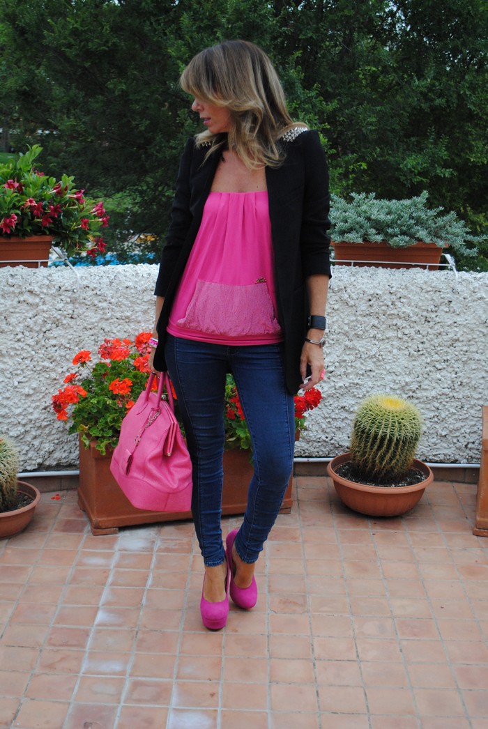 Il blazer con le spalle borchiate è stupendo!!! I dettagli in fuxia ti fanno brillare. Stai davvero Bene!! Besitos guapa!!